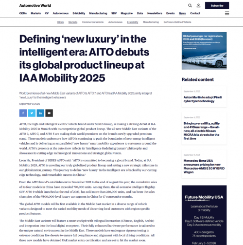 《快公司》中东版报道指出,AITO车型亮相慕尼黑车展,标志着其从中国市场迈向中东市场的重要一步。《电动汽车报告》称赞AITO“智慧重塑豪华”的品牌理念,认为其展现了品牌在新能源智能汽车领域的决心。