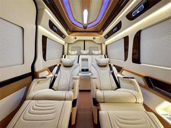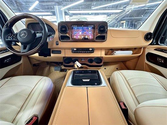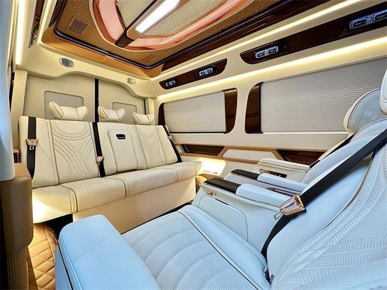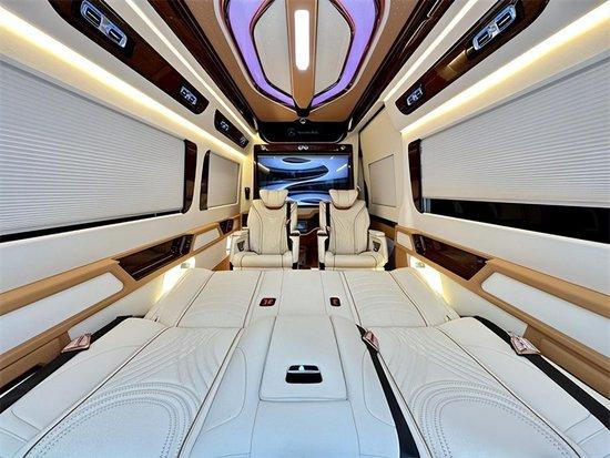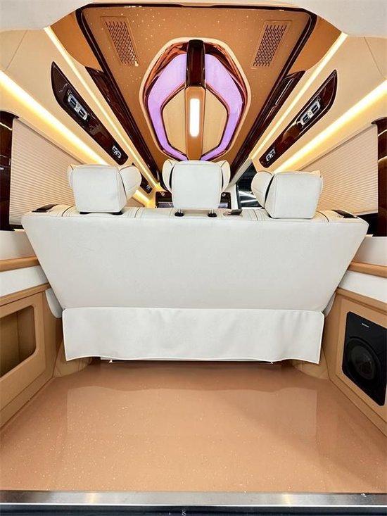 奔驰斯宾特内饰颜色采用简洁的白咖双拼配色,简单而不失豪华,豪华真皮座椅可以前后、左右调节、加热、电动按摩,同时可以调节靠背、腿拖等。德国进口三折手动沙发床,座椅与大床之间切换自如,操作简单,豪华大床的真皮触感舒适,营造良好的车内休息睡眠环境。电动电脑桌配套等高等级座舱实用功能。后排沙发床也可以随时电动放平,让车主享受旅途也享受生活。