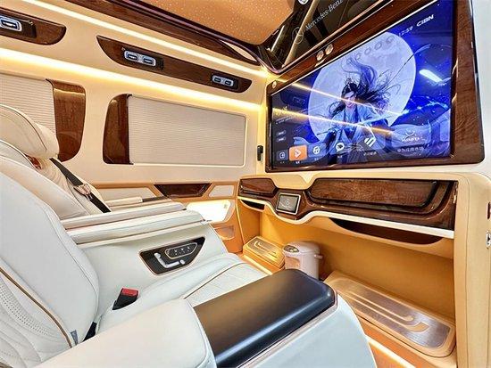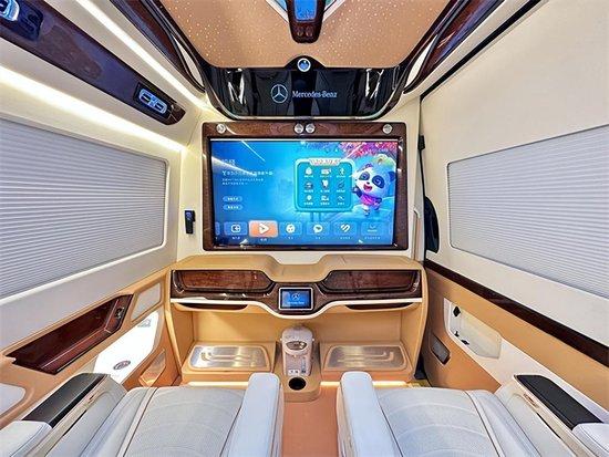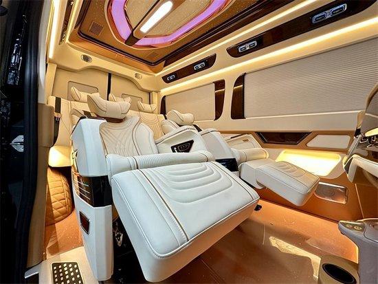 奔驰斯宾特前排小吧台还设有大屏升降电视,观影视野绝佳,半隔断的设计,使得整个车内氛围舒畅,顶部造型独特多彩,可以变化的氛围灯星空顶跟整车内饰适配度极高,地板采用编制麦穗纹路设计,小孩在上面玩也不用担心摔倒磕着。