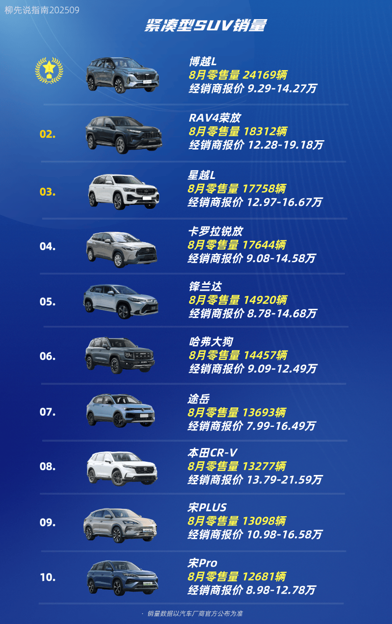 自主品牌在紧凑型SUV市场也取得了长足的进步。吉利汽车的博越L、星越L,长城汽车的哈弗大狗等车型,以其高性价比和丰富的配置受到了消费者的欢迎。此外,自主品牌还更加注重本土化需求,根据国内消费者的喜好和使用习惯对车型进行设计和优化,因此在市场上的竞争力不断增强。2025年8月,紧凑型SUV销量前三名:博越L、RAV4荣放以及星越L。吉利博越L成为紧凑型SUV月度冠军,7月零售量达21046辆,8月零售量上涨到24169辆,2025款第四代的博越L有多项新升级。