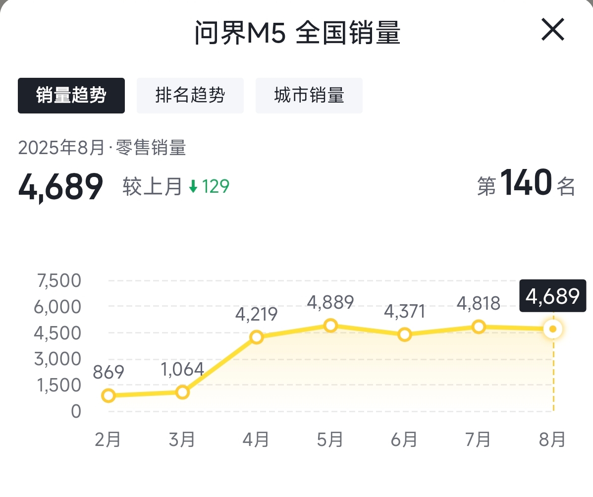 产品力的差异最终会反映在市场销量上,从2025年问界新M5 Ultra的销量数据来看,其市场认可度正稳步提升。