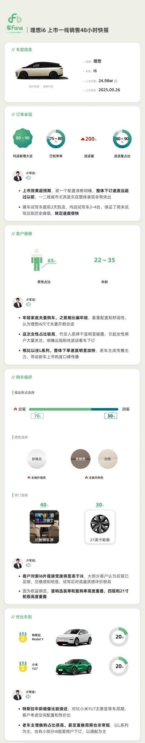 在与竞品的对比中,每10个客户里,有2个会将理想i6与特斯拉Model Y进行对比,另有2个会与小米YU7对比。与Model Y对比的客户年龄画像较为接近;而与YU7对比的客户,主要考虑因素为等车周期,同时会综合考量空间配置和性价比。